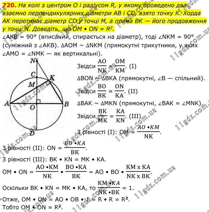 720. На колі з центром O і радіусом R, у якому проведено два взаємно перпендикулярних діаметри AB і CD, взято точку К. Хорда AK перетинає діаметр CD у точці М, а пряма BK — його продовження у точці N. Доведіть, що OM • ON = R2. ∠АКВ = 90° (вписаний, спирається на діаметр), тоді ∠NKM = 90° (суміжний з ∠AKB). ∆АОМ ~ ∆NKM (прямокутні трикутники, у яких ∠AMO = ∠NMK — як вертикальні). Звідси AO/NK = OM/KM. (І) ∆BON ~ ∆ВКА (прямокутні, ∠B — спільний). Звідси BO/BK = ON/KA. (II) ∆ВАК ~ ∆MKN (прямокутні, ∠BAK = ∠MNK). Звідси BK/MK = KA/KN. (III) З рівності (І): ОМ = (AO •KM)/NK. З рівності (IІ): ОN = (BO •KA)/BK. З рівності (IIІ): BK • KN = MK • KA. OM • ON = (AO •KM)/NK • (BO •KA)/BK = AO • BO • (KM x KA)/(NK x BK). Оскільки BK • KN = MK • KA, то (KM •KA)/(NK •BK) = 1. Отже, OM • ON = AO • OB • 1 = R • R = R2. Тобто OM • ON = R2.