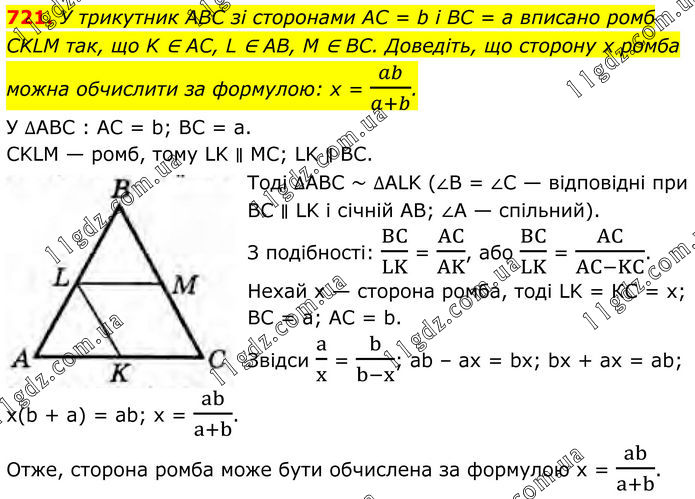 721. У трикутник ABC зі сторонами AC = b і BC = а вписано ромб CKLM так, що K ∈ AC, L ∈ AB, M ∈ BC. Доведіть, що сторону х ромба можна обчислити за формулою: х = ab/(a+b). У ∆АВС : АС = b; ВС = а. CKLM — ромб, тому LK ∥ MC; LK ∥ ВС. Тоді ∆АВС ~ ∆ALK (∠B = ∠C — відповідні при ВС ∥ LK і січній АВ; ∠A — спільний). З подібності: BC/LK = AC/AK, або BC/LK = AC/(AC-KC). Нехай x — сторона ромба, тоді LK = КС = х; ВС = а; АС = b. Звідси a/x = b/(b-x); ab – ax = bx; bx + ax = аb; х(b + а) = аb; х = ab/(a+b). Отже, сторона ромба може бути обчислена за формулою х = ab/(a+b).