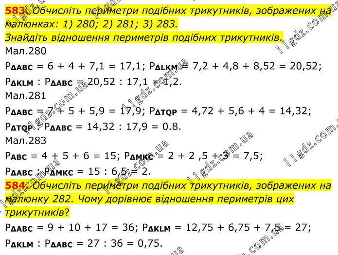 583. Обчисліть периметри подібних трикутників, зображених на малюнках: 1) 280; 2) 281; 3) 283. Знайдіть відношення периметрів подібних трикутників. Мал.280 P∆ABC = 6 + 4 + 7,1 = 17,1; Р∆LKM = 7,2 + 4,8 + 8,52 = 20,52; P∆KLM : P∆ABC = 20,52 : 17,1 = 1,2. Мал.281 P∆ABC = 7 + 5 + 5,9 = 17,9; P∆TQP = 4,72 + 5,6 + 4 = 14,32; P∆TQP : P∆ABC = 14,32 : 17,9 = 0.8. Мал.283 РABC = 4 + 5 + 6 = 15; Р∆MKC = 2 + 2 ,5 + 3 = 7,5; Р∆ABC : Р∆MKC = 15 : 6,5 = 2. 584. Обчисліть периметри подібних трикутників, зображених на малюнку 282. Чому дорівнює відношення периметрів цих трикутників? Р∆ABC = 9 + 10 + 17 = 36; P∆KLM = 12,75 + 6,75 + 7,5 = 27; Р∆KLM : P∆ABC = 27 : 36 = 0,75.
