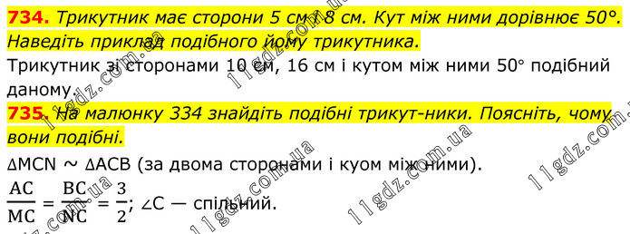 734. Трикутник має сторони 5 см і 8 см. Кут між ними дорівнює 50°. Наведіть приклад подібного йому трикутника. Трикутник зі сторонами 10 см, 16 см і кутом між ними 50° подібний даному. 735. На малюнку 334 знайдіть подібні трикутники. Поясніть, чому вони подібні. ∆MCN ~ ∆АСВ (за двома сторонами і куом між ними). AC/MC = BC/NC = 3/2; ∠C — спільний.