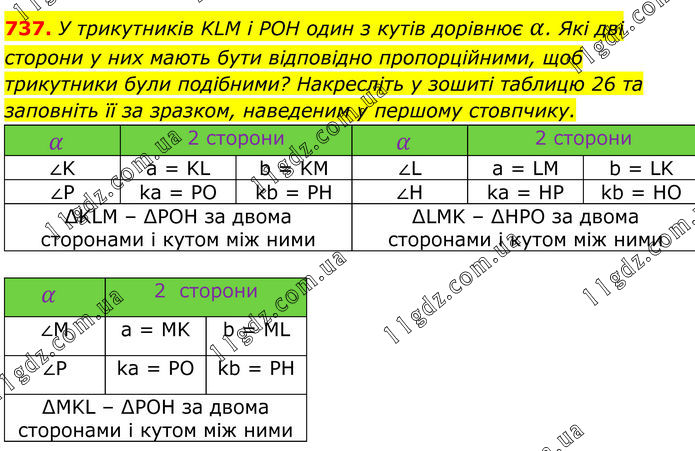 737. У трикутників KLM і POH один з кутів дорівнює α. Які дві сторони у них мають бути відповідно пропорційними, щоб трикутники були подібними? Накресліть у зошиті таблицю 26 та заповніть її за зразком, наведеним у першому стовпчику.