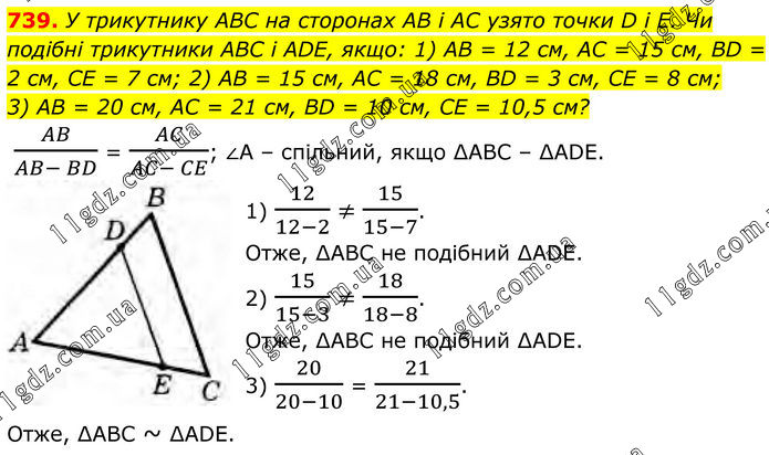 739. У трикутнику ABC на сторонах AB і AC узято точки D і Е. Чи подібні трикутники ABC і ADE, якщо: 1) AB = 12 см, AC = 15 см, BD = 2 см, CE = 7 см; 2) AB = 15 см, AC = 18 см, BD = 3 см, CE = 8 см; 3) AB = 20 см, AC = 21 см, BD = 10 см, CE = 10,5 см? AB/(AB- BD) = AC/(AC- CE); ∠A – спільний, якщо ∆ABC – ∆ADE. 1) 12/(12-2) ≠ 15/(15-7). Отже, ∆АВС не подібний ∆ADE. 2) 15/(15-3) ≠ 18/(18-8). Отже, ∆АВС не подібний ∆ADE. 3) 20/(20-10) = 21/(21-10,5). Отже, ∆АВС ~ ∆ADE.