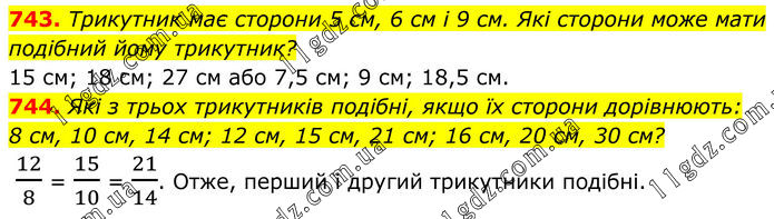 743. Трикутник має сторони 5 см, 6 см і 9 см. Які сторони може мати подібний йому трикутник? 15 см; 18 см; 27 см або 7,5 см; 9 см; 18,5 см. 744. Які з трьох трикутників подібні, якщо їх сторони дорівнюють: 8 см, 10 см, 14 см; 12 см, 15 см, 21 см; 16 см, 20 см, 30 см? 12/8 = 15/10 = 21/14. Отже, перший і другий трикутники подібні.