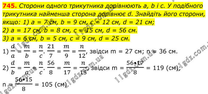 745. Сторони одного трикутника дорівнюють a, b і с. У подібного трикутника найменша сторона дорівнює d. Знайдіть його сторони, якщо: 1) a = 7 см, b = 9 см, с = 12 см, d = 21 см; 2) a = 17 см, b = 8 см, с = 15 см, d = 56 см. 3) a = 6 см, b = 5 см, с = 9 см, d = 25 см. 1) d/a = m/b = n/c. 21/7 = m/9 = n/12, звідси m = 27 см; n = 36 см. 2) d/b = m/a = n/c. 56/8 = m/17 = n/15, звідси m = (56•17)/8 = 119 (см); n = (56•15)/8 = 105 (см).