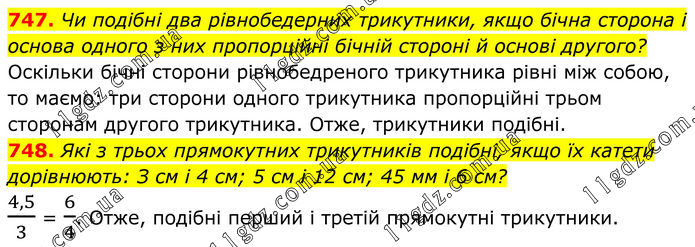 747. Чи подібні два рівнобедерних трикутники, якщо бічна сторона і основа одного з них пропорційні бічній стороні й основі другого? Оскільки бічні сторони рівнобедреного трикутника рівні між собою, то маємо: три сторони одного трикутника пропорційні трьом сторонам другого трикутника. Отже, трикутники подібні. 748. Які з трьох прямокутних трикутників подібні, якщо їх катети дорівнюють: З см і 4 см; 5 см і 12 см; 45 мм і 6 см? 4,5/3 = 6/4. Отже, подібні перший і третій прямокутні трикутники.