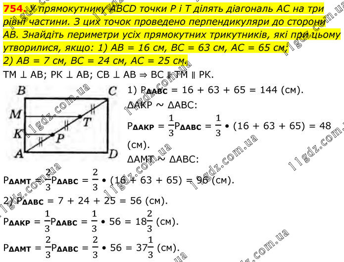 754. У прямокутнику ABCD точки P і Т ділять діагональ АС на три рівні частини. З цих точок проведено перпендикуляри до сторони AB. Знайдіть периметри усіх прямокутних трикутників, які при цьому утворилися, якщо: 1) AB = 16 см, BC = 63 см, AC = 65 см; 2) AB = 7 см, BC = 24 см, AC = 25 см. ТМ ⊥ АВ; РК ⊥ АВ; СВ ⊥ АВ ⇒ ВС ∥ ТМ ∥ РК. 1) Р∆АВС = 16 + 63 + 65 = 144 (см). ∆АКР ~ ∆АВС: P∆AKP = 1/3P∆ABC = 1/3 • (16 + 63 + 65) = 48 (см). ∆АМТ ~ ∆АВС: P∆AMT = 2/3P∆ABC = 2/3 • (16 + 63 + 65) = 96 (см). 2) P∆ABC = 7 + 24 + 25 = 56 (см). P∆AKP = 1/3P∆ABC = 1/3 • 56 = 182/3 (cм). P∆AMT = 2/3P∆АВС = 2/3 • 56 = 371/3 (cм).