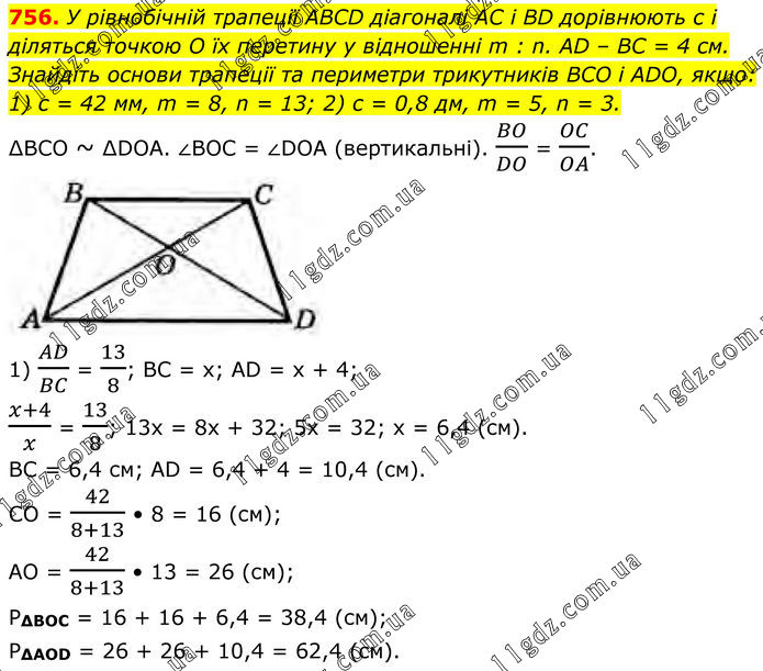 756. У рівнобічній трапеції ABCD діагоналі АС і BD дорівнюють с і діляться точкою O їх перетину у відношенні m : n. AD – BC = 4 см. Знайдіть основи трапеції та периметри трикутників BCO і ADO, якщо: 1) с = 42 мм, m = 8, n = 13; 2) с = 0,8 дм, m = 5, n = 3. ∆BCO ~ ∆DOA. ∠BOC = ∠DOA (вертикальні). BO/DO = OC/OA. 1) AD/BC = 13/8; BC = x; AD = x + 4; (x+4)/x = 13/8; 13x = 8x + 32; 5x = 32; x = 6,4 (cм). BC = 6,4 cм; AD = 6,4 + 4 = 10,4 (cм). CO = 42/(8+13) • 8 = 16 (см); AO = 42/(8+13) • 13 = 26 (см); P∆BOC = 16 + 16 + 6,4 = 38,4 (cм); P∆AOD = 26 + 26 + 10,4 = 62,4 (cм).