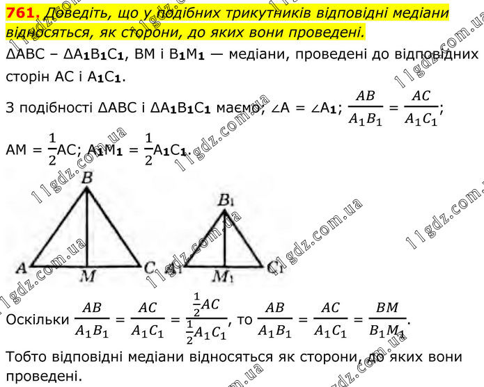 761. Доведіть, що у подібних трикутників відповідні медіани відносяться, як сторони, до яких вони проведені. ∆АВС – ∆A1В1С1, ВМ і В1М1 — медіани, проведені до відповідних сторін АС і А1С1. З подібності ∆АBС і ∆А1В1С1 маємо; ∠A = ∠A1; AB/(A_1 B_1 ) = AC/(A_1 C_1 ); AM = 1/2AC; A1M1 = 1/2A1C1. Оскільки AB/(A_1 B_1 ) = AC/(A_1 C_1 ) = (1/2 AC)/(1/2 A_1 C_1 ), то AB/(A_1 B_1 ) = AC/(A_1 C_1 ) = BM/(B_1 M_1 ). Тобто відповідні медіани відносяться як сторони, до яких вони проведені.