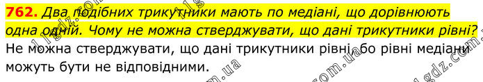 762. Два подібних трикутники мають по медіані, що дорівнюють одна одній. Чому не можна стверджувати, що дані трикутники рівні? Не можна стверджувати, що дані трикутники рівні, бо рівні медіани можуть бути не відповідними.
