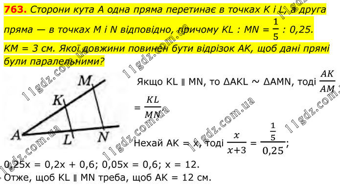 763. Сторони кута А одна пряма перетинає в точках K і L, а друга пряма — в точках M і N відповідно, причому KL : MN = 1/5 : 0,25. KM = 3 см. Якої довжини повинен бути відрізок AK, щоб дані прямі були паралельними? Якщо KL ∥ MN, тo ∆AKL ~ ∆AMN, тоді AK/AM = KL/MN. Нехай AK = x, тоді x/(x+3) = (1/5)/0,25; 0,25x = 0,2x + 0,6; 0,05x = 0,6; x = 12. Отже, щоб KL ∥ MN треба, щоб AK = 12 см.