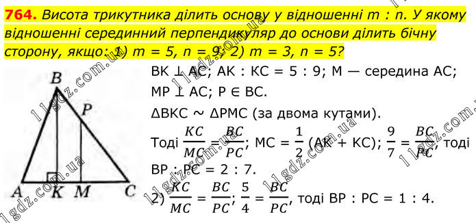 764. Висота трикутника ділить основу у відношенні m : n. У якому відношенні серединний перпендикуляр до основи ділить бічну сторону, якщо: 1) m = 5, n = 9; 2) m = 3, n = 5? BK ⊥ AC; AK : КС = 5 : 9; М — середина AC; MP ⊥ AC; P ∈ ВС. ∆BKC ~ ∆РМС (за двома кутами). Тоді KC/MC = BC/PC; MC = 1/2 (AK + KC); 9/7 = BC/PC, тоді BP : PC = 2 : 7. 2) KC/MC = BC/PC; 5/4 = BC/PC, тоді BP : PC = 1 : 4.