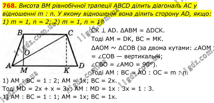 768. Висота BM рівнобічної трапеції ABCD ділить діагональ AC у відношенні m : n. У якому відношенні вона ділить сторону AD, якщо: 1) m = 1, n = 2; 2) m = 1, n = 1? CK ⊥ AD. ∆ABM = ∆DCK. Тоді АM = DK, ВС = МК. ∆АОМ ~ ∆СОВ (за двома кутами: ∠AOM = ∠COB — вертикальні; ∠CBO = ∠AMO = 90°). Тоді AM : ВС = AО : ОС = m : n. 1) АМ : ВС = 1 : 2; AM = 1x; BC = 2x. Тоді MD = 2х + х = Зх; AM : MD = 1x : 3x = 1 : 3. 1) АМ : ВС = 1 : 1; AM = 1x; ВС = 1x.