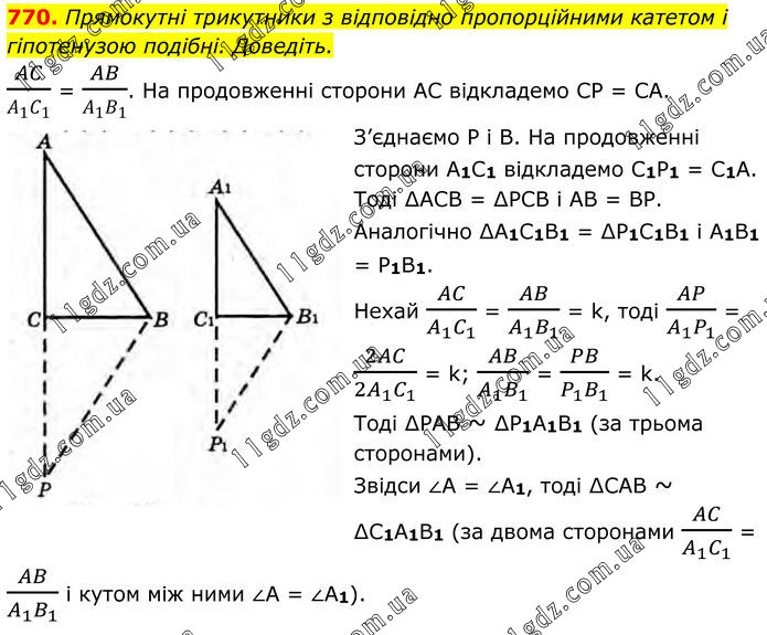 770. Прямокутні трикутники з відповідно пропорційними катетом і гіпотенузою подібні. Доведіть. AC/(A_1 C_1 ) = AB/(A_1 B_1 ). На продовженні сторони АС відкладемо СР = СА. З’єднаємо Р і В. На продовженні сторони A1C1 відкладемо С1Р1 = С1A. Тоді ∆АСB = ∆РСВ і AB = ВР. Аналогічно ∆А1С1В1 = ∆Р1С1В1 і А1В1 = Р1В1. Нехай AC/(A_1 C_1 ) = AB/(A_1 B_1 ) = k, тоді AP/(A_1 P_1 ) = 2AC/(〖2A〗_1 C_1 ) = k; AB/(A_1 B_1 ) = PB/(P_1 B_1 ) = k. Тоді ∆РАВ ~ ∆Р1А1В1 (за трьома сторонами). Звідси ∠A = ∠A1, тоді ∆САВ ~ ∆C1A1В1 (за двома сторонами AC/(A_1 C_1 ) = AB/(A_1 B_1 ) і кутом між ними ∠A = ∠A1).