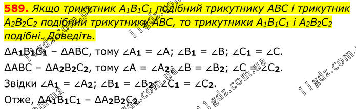 589. Якщо трикутник A1B1C1 подібний трикутнику ABC і трикутник A2B2C2 подібний трикутнику ABC, то трикутники A1B1C1 і A2B2C2 подібні. Доведіть. ∆A1B1C1 – ∆АВС, тому ∠A1 = ∠A; ∠B1 = ∠B; ∠C1 = ∠C. ∆АВС – ∆A2B2C2, тому ∠A = ∠A2; ∠B = ∠B2; ∠C = ∠C2. Звідки ∠A1 = ∠A2; ∠B1 = ∠B2; ∠C1 = ∠C2. Отже, ∆А1В1С1 – ∆A2B2C2.