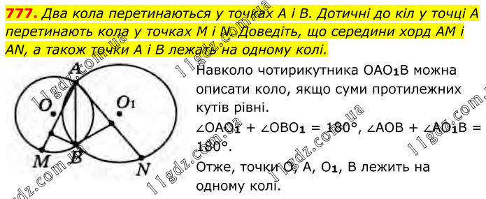 777. Два кола перетинаються у точках А і В. Дотичні до кіл у точці А перетинають кола у точках M і N. Доведіть, що середини хорд AM і AN, а також точки А і В лежать на одному колі. Навколо чотирикутника OAO1B можна описати коло, якщо суми протилежних кутів рівні. ∠ОАО1 + ∠OBO1 = 180°, ∠AOB + ∠АО1В = 180°. Отже, точки О, А, O1, В лежить на одному колі.