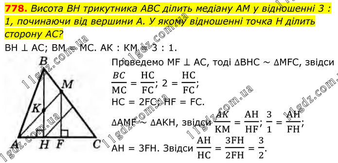 778. Висота BH трикутника ABC ділить медіану AM у відношенні 3 : 1, починаючи від вершини А. У якому відношенні точка Н ділить сторону AC? ВН ⊥ АС; ВМ = МС. АК : КМ = 3 : 1. Проведемо MF ⊥ AC, тоді ∆BHC ~ ∆MFC, звідси BC/MC = HC/FC; 2 = HC/FC; HC = 2FC; HF = FC. ∆AMF ~ ∆AKH, звідси AK/KM = AH/HF; 3/1 = AH/FH; AH = 3FH. Звідси AH/HC = 3FH/2FH = 3/2.