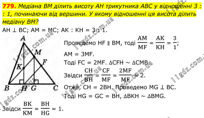 779. Медіана BM ділить висоту AH трикутника ABC у відношенні 3 : : 1, починаючи від вершини. У якому відношенні ця висота ділить медіану BM? AH ⊥ BC; AM = MC; AK : KH = 3 : 1. Проведемо HF ∥ BM, тоді AM/MF = AK/KH = 3/1; AM = 3MF. Тоді FC = 2MF. ∆CFH ~ ∆CMB. Звідси CH/BH = CF/MF = 2MF/MF = 2. Отже, CH = 2BH. Проведемо MG ⊥ BC. Тоді HG = GC = BH, ∆BKH ~ ∆BMG. Звідси BK/KM = BH/HG = 1.