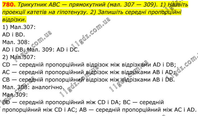 780. Трикутник ABC — прямокутний (мал. 307 — 309). 1) Назвіть проекції катетів на гіпотенузу. 2) Запишіть середні пропорційні відрізки. 1) Мал.307: AD і BD. Мал. 308: AD і DB. Мал. 309: AD і DC. 2) Мал.307: CD — середній пропорційний відрізок між відрізками AD і DB; AC — середній пропорційний відрізок між відрізками AB і AD; СВ — середній пропорційний відрізок між відрізками AB і DB. Мал. 308: аналогічно. Мал.309: BD — середній пропорційний між CD і DA; ВС — середній пропорційний між CD і АС; AB — середній пропорційний між AС і AD.