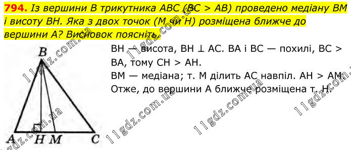 794. Із вершини В трикутника ABC (BС > AB) проведено медіану BM і висоту BH. Яка з двох точок (M чи H) розміщена ближче до вершини A? Висновок поясніть. ВН — висота, ВН ⊥ АС. ВA і ВС — похилі, ВС > ВА, тому СН > АН. ВМ — медіана; т. М ділить АС навпіл. АН > АМ. Отже, до вершини А ближче розміщена т. Н.