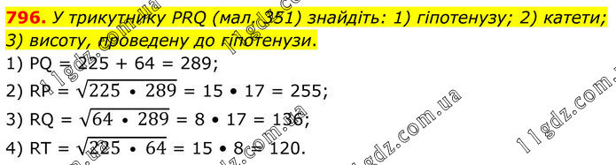 796. У трикутнику PRQ (мал. 351) знайдіть: 1) гіпотенузу; 2) катети; 3) висоту, проведену до гіпотенузи. 1) PQ = 225 + 64 = 289; 2) RP = √(225 • 289) = 15 • 17 = 255; 3) RQ = √(64 • 289) = 8 • 17 = 136; 4) RT = √(225 • 64) = 15 • 8 = 120.