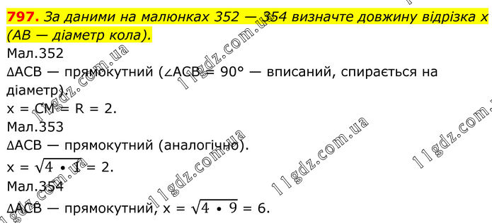 797. За даними на малюнках 352 — 354 визначте довжину відрізка х (AB — діаметр кола). Мал.352 ∆АСВ — прямокутний (∠ACB = 90° — вписаний, спирається на діаметр). x = CM = R = 2. Мал.353 ∆АСВ — прямокутний (аналогічно). х = √(4 • 1) = 2. Мал.354 ∆АСВ — прямокутний, x = √(4 • 9) = 6.