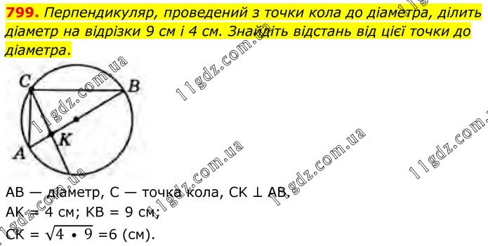 799. Перпендикуляр, проведений з точки кола до діаметра, ділить діаметр на відрізки 9 см і 4 см. Знайдіть відстань від цієї точки до діаметра. AB — діаметр, С — точка кола, СK ⊥ AB. AK = 4 cм; KB = 9 см; СК = √(4 • 9) =6 (см).