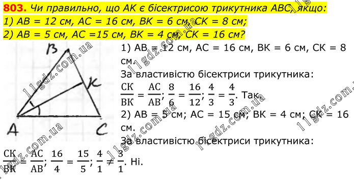 803. Чи правильно, що AK є бісектрисою трикутника ABC, якщо: 1) AB = 12 см, AC = 16 см, BK = 6 см, CK = 8 см; 2) AB = 5 см, AC =15 см, BK = 4 см, CK = 16 см? 1) АВ = 12 см, АС = 16 см, ВК = 6 см, СК = 8 см. За властивістю бісектриси трикутника: СК/ВК = АС/АВ; 8/6 = 16/12; 4/3 = 4/3. Так. 2) АВ = 5 см; АС = 15 см; ВК = 4 см; СК = 16 см. За властивістю бісектриси трикутника: СК/ВК = АС/АВ; 16/4 = 15/5; 4/1 ≠ 3/1. Ні.
