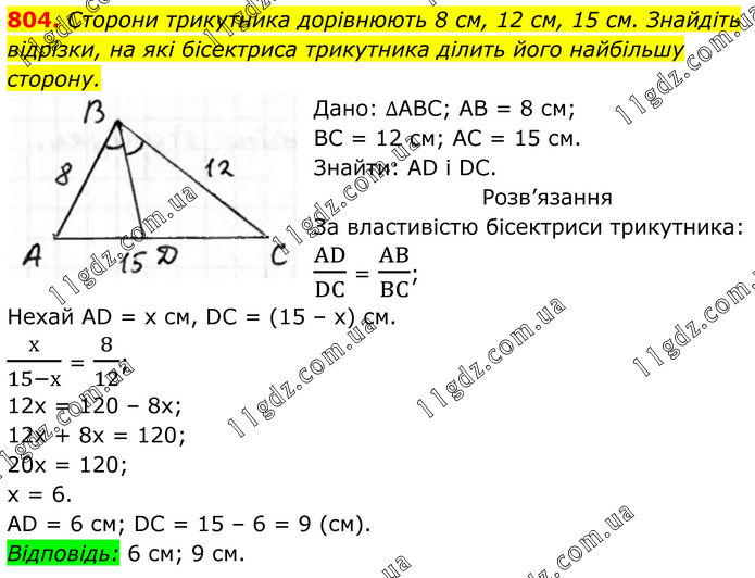 804. Сторони трикутника дорівнюють 8 см, 12 см, 15 см. Знайдіть відрізки, на які бісектриса трикутника ділить його найбільшу сторону. Дано: ∆АВС; АВ = 8 см; ВС = 12 см; АС = 15 см. Знайти: AD i DC. Розв’язання За властивістю бісектриси трикутника: AD/DC = AB/BC; Нехай AD = x см, DC = (15 – x) см. х/(15-х) = 8/12; 12x = 120 – 8x; 12x + 8x = 120; 20x = 120; x = 6. AD = 6 см; DC = 15 – 6 = 9 (см). Відповідь: 6 см; 9 см.