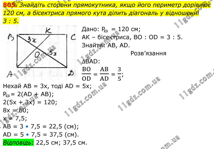 805. Знайдіть сторони прямокутника, якщо його периметр дорівнює 120 см, а бісектриса прямого кута ділить діагональ у відношенні З : 5. Дано: Р = 120 см; АК – бісектриса, BO : OD = 3 : 5. Знайти: AB, AD. Розв’язання ∆BAD: BO/OD = AB/AD = 3/5; Нехай АВ = 3х, тоді AD = 5x; P = 2(AD + AB); 2(5x + 3x) = 120; 8x = 60; x = 7,5; AB = 3 • 7,5 = 22,5 (см); AD = 5 • 7,5 = 37,5 (см). Відповідь: 22,5 см; 37,5 см.