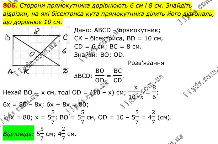 806. Сторони прямокутника дорівнюють 6 см і 8 см. Знайдіть відрізки, на які бісектриса кута прямокутника ділить його діагональ, що дорівнює 10 см. Дано: ABCD – прямокутник; СК – бісектриса, BD = 10 см, CD = 6 см; ВС = 8 см. Знайти: BO; OD. Розв’язання ∆BCD: BO/OD = BC/CD. Нехай ВО = х см, тоді OD = (10 – x) см; х/(10-х) = 8/6; 6x = 80 – 8x; 6x + 8x = 80; 14x = 80; x = 55/7; BO = 55/7 см, OD = 10 – 55/7 = 42/7 (см). Відповідь: 55/7 см; 42/7 см.