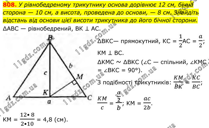 808. У рівнобедреному трикутнику основа дорівнює 12 см, бічна сторона — 10 см, а висота, проведена до основи, — 8 см. Знайдіть відстань від основи цієї висоти трикутника до його бічної сторони. ∆АВС — рівнобедрений, ВК ⊥ АС. ∆ВКС— прямокутний, КС = 1/2АС = a/2; КМ ⊥ BC. ∆KMC ~ ∆BKC (∠C — спільний, ∠KMC = ∠BKC = 90°). З подібності трикутників: KM/BK = KC/BC; KM/c = (a/2)/b; KM = ac/2b. KM = (12• 8)/(2•10) = 4,8 (см).