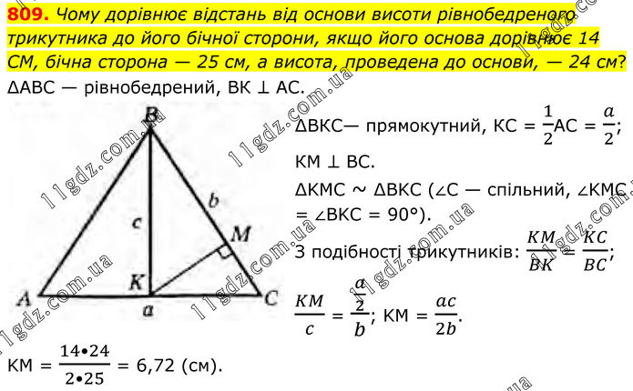 809. Чому дорівнює відстань від основи висоти рівнобедреного трикутника до його бічної сторони, якщо його основа дорівнює 14 CM, бічна сторона — 25 см, а висота, проведена до основи, — 24 см? ∆АВС — рівнобедрений, ВК ⊥ АС. ∆ВКС— прямокутний, КС = 1/2АС = a/2; КМ ⊥ BC. ∆KMC ~ ∆BKC (∠C — спільний, ∠KMC = ∠BKC = 90°). З подібності трикутників: KM/BK = KC/BC; KM/c = (a/2)/b; KM = ac/2b. KM = (14•24)/(2•25) = 6,72 (см).