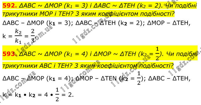 592. ∆ABC ~ ∆MOP (k1 = 3) і ∆ABC ~ ∆TEH (k2 = 2). Чи подібні трикутники МОР і TEH? 3 яким коефіцієнтом подібності? ∆ABC – ∆MОР (k1 = 3); ∆ABC – ∆TEH (k2 = 2); ∆MOP – ∆TEH, k = k_2/k_1 = 2/3. 593. ∆ABC ~ ∆MOP (k1 = 4) і ∆MOP ~ ∆TEH (k2 = 1/2). Чи подібні трикутники ABС і TEH? 3 яким коефіцієнтом подібності? ∆АВС – ∆МОР (k1 = 4); ∆МОР – ∆TEN (k2 = 1/2); ∆ABC – ∆TEH, k = k1 • k2 = 4 • 1/2 = 2.