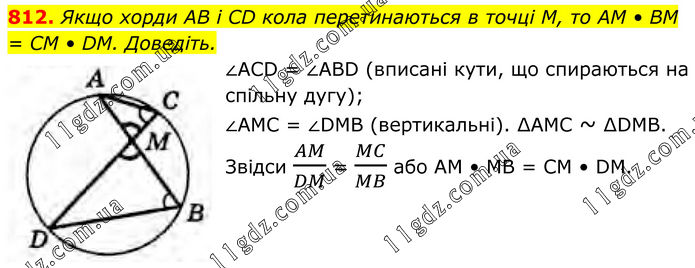 812. Якщо хорди AB і CD кола перетинаються в точці М, то AM • BM = CM • DM. Доведіть. ∠ACD = ∠ABD (вписані кути, що спираються на спільну дугу); ∠AMC = ∠DMB (вертикальні). ∆АМС ~ ∆DMВ. Звідси AM/DM = MC/MB або AM • MB = CM • DM.