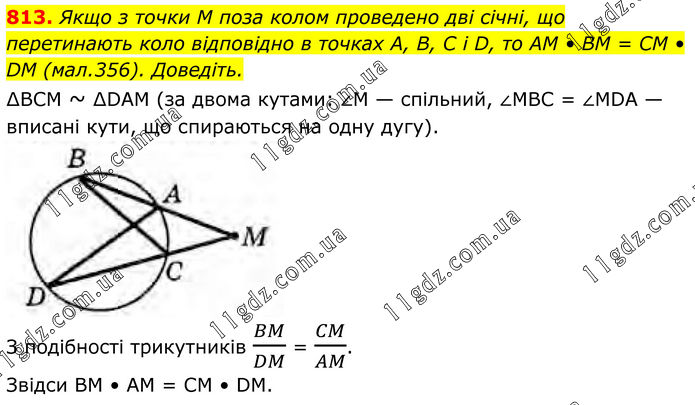 813. Якщо з точки M поза колом проведено дві січні, що перетинають коло відповідно в точках А, В, C і D, то AM • BM = CM • DM (мал.356). Доведіть. ∆BCM ~ ∆DAM (за двома кутами: ∠M — спільний, ∠MBC = ∠MDA — вписані кути, що спираються на одну дугу). З подібності трикутників BM/DM = CM/AM. Звідси ВМ • АМ = CM • DM.