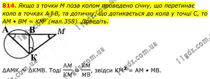 814. Якщо з точки M поза колом проведено січну, що перетинає коло в точках A і В, та дотичну, що дотикається до кола у точці С, то AM • BM = КM2 (мал.358). Доведіть. ∆АMК ~ ∆КMВ. Тоді АM/КM = КM/MВ, звідси КМ2 = АМ • МВ.