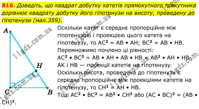 816. Доведіть, що квадрат добутку катетів прямокутного трикутника дорівнює квадрату добутку його гіпотенузи на висоту, проведену до гіпотенузи (мал.359). Оскільки катет є середнє пропорційне між гіпотенузою і проекцією цього катета на гіпотенузу, то АС2 = АВ • АН; ВС2 = АВ • НВ. Перемножимо почлено ці рівності: АС2 • ВС2 = АВ • АН • АВ • НВ = АВ2 • АН • НВ. АК і НВ — проекції катетів на гіпотенузу. Оскільки висота, проведена до гіпотенузи є середнє пропорційне між проекціями катетів на гіпотенузу, то СН2 = АН • НВ. Тоді АС2 • ВС2 = АВ2 • СН2 або (АС • BC)2 = (AB • CН)2.