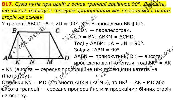 817. Сума кутів при одній з основ трапеції дорівнює 90°. Доведіть, що висота трапеції є середнім пропорційним між проекціями її бічних сторін на основу. У трапеції ABCD ∠A + ∠D = 90°. З т. В проведемо BN ∥ CD. BCDN — паралелограм. CD = BN; ∆ВКМ = ∆CMD. Тоді у ∆АВМ: ∠A + ∠N = 90°. Звідси ∠ABN = 90°. ∆ABN — прямокутний, ВК — висота, проведена до гіпотенузи, тоді ВК2 = АК • KN (висота — середнє пропорційне між проекціями катетів на гіпотенузу). Оскільки KN = MD (з рівності ∆BKN і ∆CMD), то ВK2 = АК • MD або висота трапеції — середнє пропорційне між проекціями бічних сторін на основу.