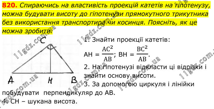 820. Спираючись на властивість проекцій катетів на гіпотенузу, можна будувати висоту до гіпотенузи прямокутного трикутника без використання транспортира чи косинця. Поясніть, як це можна зробити. 1. Знайти проекції катетів: АН = 〖АС〗^2/АВ; ВН = 〖ВС〗^2/АВ. 2. На гіпотенузі відкласти ці відрізки і знайти основу висоти. 3. За допомогою циркуля і лінійки побудувати перпендикуляр до АВ. 4. СН – шукана висота.