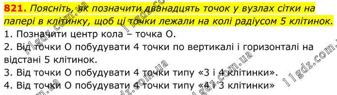 821. Поясніть, як позначити дванадцять точок у вузлах сітки на папері в клітинку, щоб ці точки лежали на колі радіусом 5 клітинок. 1. Позначити центр кола – точка О. 2. Від точки О побудувати 4 точки по вертикалі і горизонталі на відстані 5 клітинок. 3. Від точки О побудувати 4 точки типу «3 і 4 клітинки». 4. Від точки О побудувати 4 точки типу «4 і 3 клітинки».