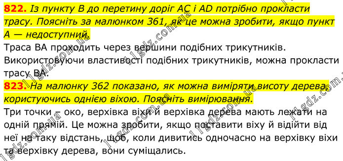 822. Із пункту В до перетину доріг AC і AD потрібно прокласти трасу. Поясніть за малюнком 361, як це можна зробити, якщо пункт А — недоступний. Траса ВА проходить через вершини подібних трикутників. Використовуючи властивості подібних трикутників, можна прокласти трасу ВА. 823. На малюнку 362 показано, як можна виміряти висоту дерева, користуючись однією віхою. Поясніть вимірювання. Три точки – око, верхівка віхи й верхівка дерева мають лежати на одній прямій. Це можна зробити, якщо поставити віху й відійти від неї на таку відстань, щоб, коли дивитись одночасно на верхівку віхи та верхівку дерева, вони суміщались.