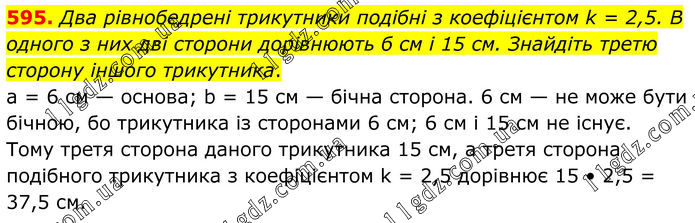 595. Два рівнобедрені трикутники подібні з коефіцієнтом k = 2,5. В одного з них дві сторони дорівнюють б см і 15 см. Знайдіть третю сторону іншого трикутника. a = 6 см — основа; b = 15 см — бічна сторона. 6 см — не може бути бічною, бо трикутника із сторонами 6 см; 6 см і 15 см не існує. Тому третя сторона даного трикутника 15 см, а третя сторона подібного трикутника з коефіцієнтом k = 2,5 дорівнює 15 • 2,5 = 37,5 см.