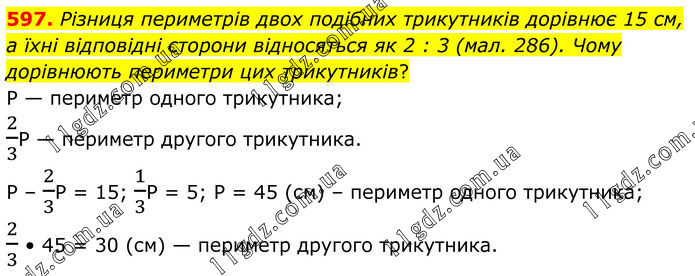 597. Різниця периметрів двох подібних трикутників дорівнює 15 см, а їхні відповідні сторони відносяться як 2 : 3 (мал. 286). Чому дорівнюють периметри цих трикутників? Р — периметр одного трикутника; 2/3Р — периметр другого трикутника. Р – 2/3Р = 15; 1/3Р = 5; Р = 45 (см) – периметр одного трикутника; 2/3 • 45 = 30 (см) — периметр другого трикутника.