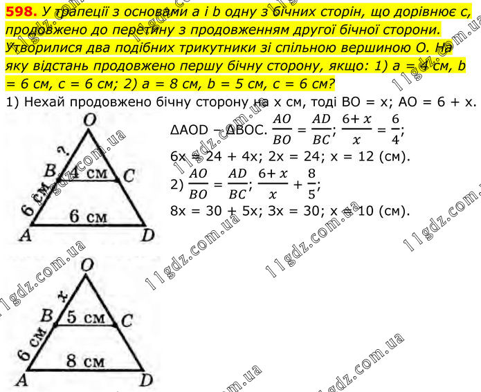 598. У трапеції з основами a і b одну з бічних сторін, що дорівнює с, продовжено до перетину з продовженням другої бічної сторони. Утворилися два подібних трикутники зі спільною вершиною О. На яку відстань продовжено першу бічну сторону, якщо: 1) a = 4 см, b = 6 см, с = 6 см; 2) a = 8 см, b = 5 см, с = 6 см? 1) Нехай продовжено бічну сторону на x см, тоді ВО = х; АО = 6 + х. ∆AOD – ∆BOC. AO/BO = AD/BC; (6+ x)/x = 6/4; 6х = 24 + 4х; 2x = 24; x = 12 (см). 2) AO/BO = AD/BC; (6+ x)/x + 8/5; 8x = 30 + 5х; Зх = 30; х = 10 (см).