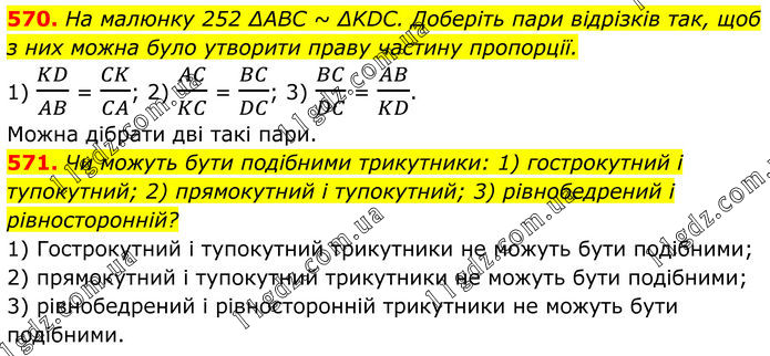 570. На малюнку 252 ∆ABC ~ ∆KDC. Доберіть пари відрізків так, щоб з них можна було утворити праву частину пропорції. 1) KD/AB = CK/CA; 2) AC/KC = BC/DC; 3) BC/DC = AB/KD. Можна дібрати дві такі пари. 571. Чи можуть бути подібними трикутники: 1) гострокутний і тупокутний; 2) прямокутний і тупокутний; 3) рівнобедрений і рівносторонній? 1) Гострокутний і тупокутний трикутники не можуть бути подібними; 2) прямокутний і тупокутний трикутники не можуть бути подібними; 3) рівнобедрений і рівносторонній трикутники не можуть бути подібними.