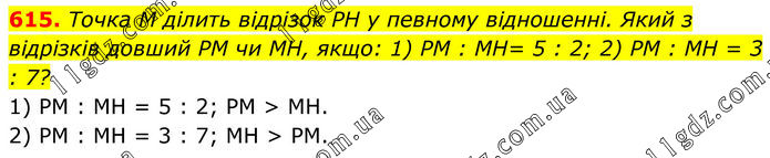 615. Точка M ділить відрізок PH у певному відношенні. Який з відрізків довший PM чи MH, якщо: 1) PM : MH= 5 : 2; 2) PM : MH = 3 : 7? 1) РМ : МН = 5 : 2; РМ > МН. 2) РМ : МН = 3 : 7; МН > РМ.