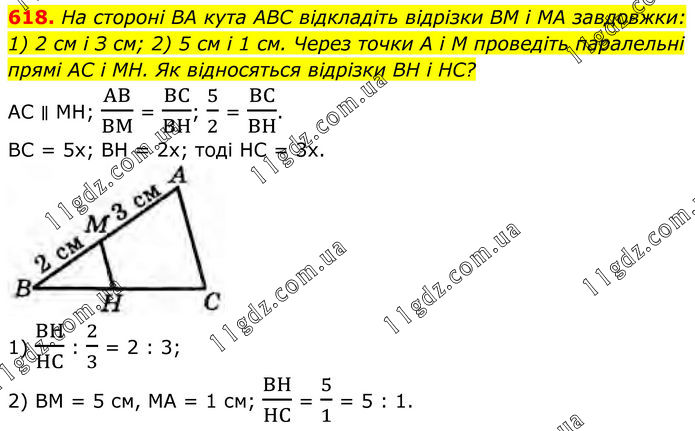 618. На стороні BA кута ABC відкладіть відрізки BM і MA завдовжки: 1) 2 см і З см; 2) 5 см і 1 см. Через точки А і M проведіть паралельні прямі AC i MH. Як відносяться відрізки BH і HC? AC ∥ MH; AB/BM = BC/BH; 5/2 = BC/BH. BC = 5x; BH = 2x; тоді HC = 3x. 1) BH/HC : 2/3 = 2 : 3; 2) ВM = 5 см, МА = 1 см; BH/HC = 5/1 = 5 : 1.