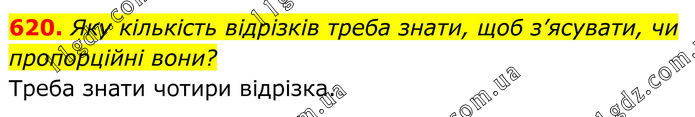 620. Яку кількість відрізків треба знати, щоб з’ясувати, чи пропорційні вони? Треба знати чотири відрізка.