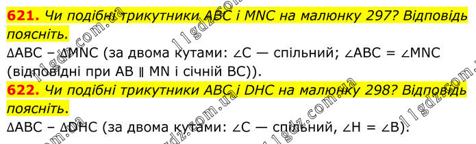 621. Чи подібні трикутники ABC і MNC на малюнку 297? Відповідь поясніть. ∆АВС – ∆MNC (за двома кутами: ∠C — спільний; ∠ABC = ∠MNC (відповідні при AB ∥ MN і січній ВС)). 622. Чи подібні трикутники ABC і DHC на малюнку 298? Відповідь поясніть. ∆АВС – ∆DHC (за двома кутами: ∠C — спільний, ∠Н = ∠B).