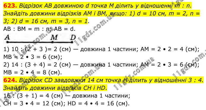 623. Відрізок AB довжиною d точка M ділить у відношенні m : n. Знайдіть довжини відрізків AM і BM, якщо: 1) d = 10 см, m = 2, n = 3; 2) d = 16 см, m = 3, n = 1. AB : BM = m : n; AB = d. 1) 10 : (2 + 3 )= 2 (см) — довжина 1 частини; AM = 2 • 2 = 4 (cм); MB = 2 • 3 = 6 (см); 2) 14 : (З + 4) = 2 (см) — довжина 1 частини; AM = 2 • 3 = 6 (см); MB = 2 • 4 = 8 (см). 624. Відрізок CD завдовжки 14 см точка H ділить у відношенні 3 : 4. Знайдіть довжини відрізків CH і HD. 16 : (З + 1) = 4 (см) — довжина 1 частини; CH = 3 • 4 = 12 (см); HD = 4 • 4 = 16 (см).